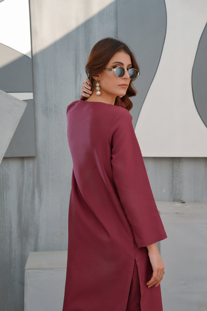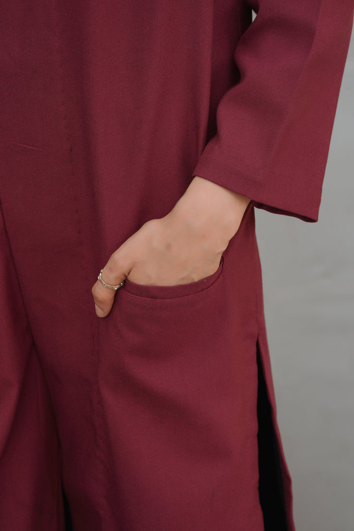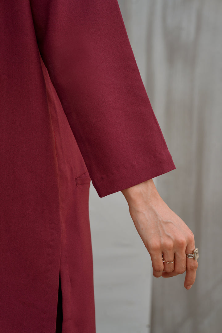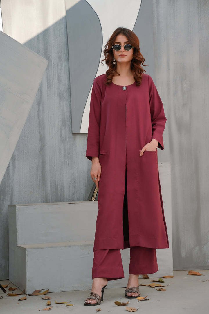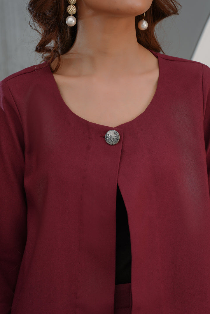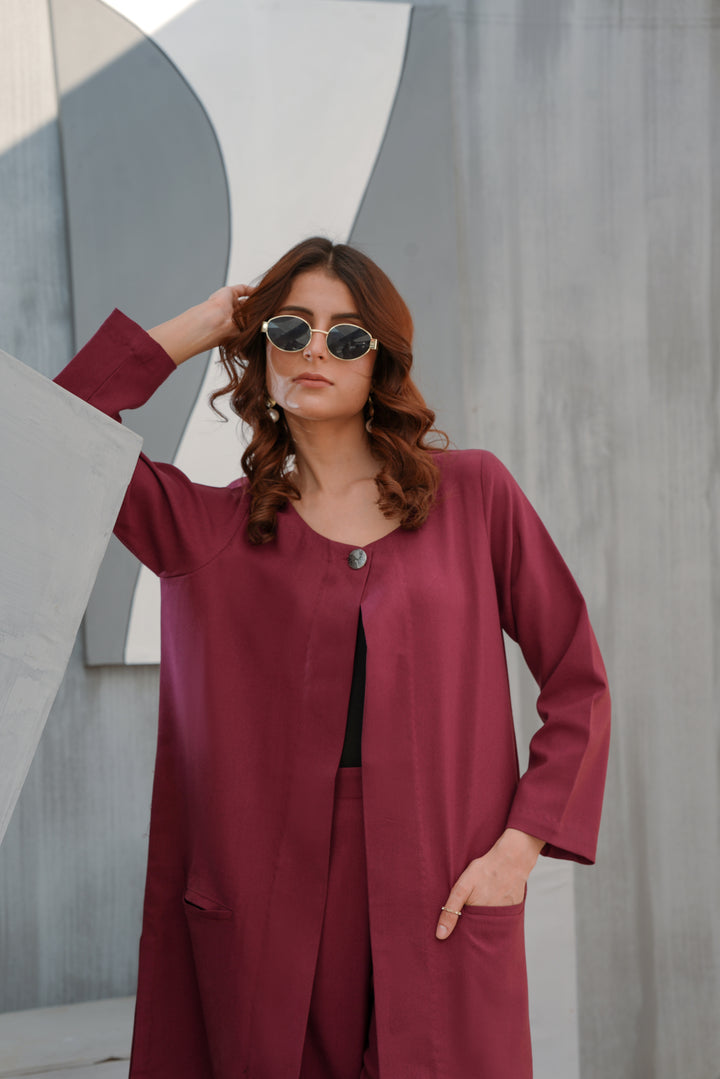 "Make a statement with our striking red coat, featuring a dramatic V-open front and round neckline. A single top button adds a touch of understated elegance, while straight sleeves and front pockets provide a practical yet polished touch. Paired with sleek bell trousers, this ensemble commands attention and exudes confident sophistication."