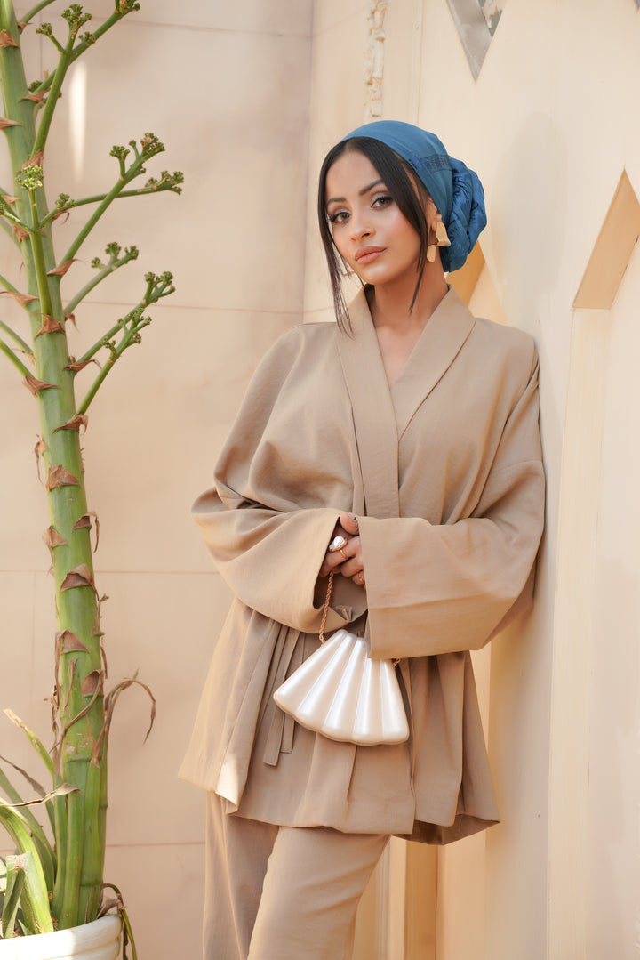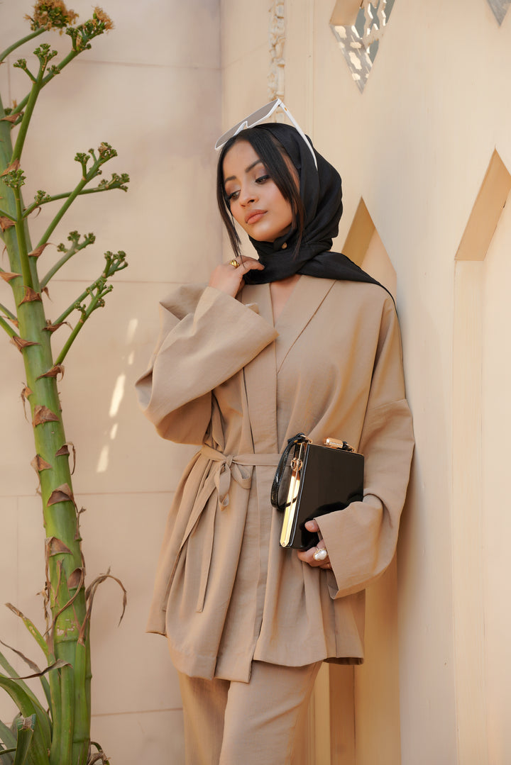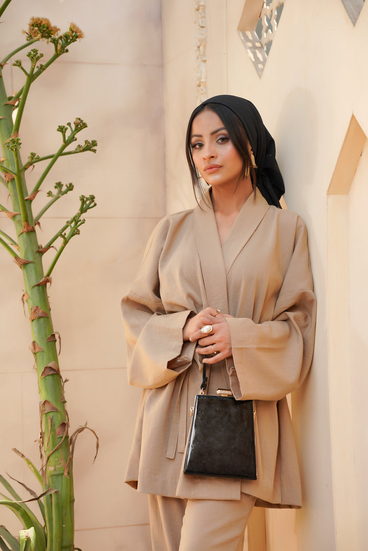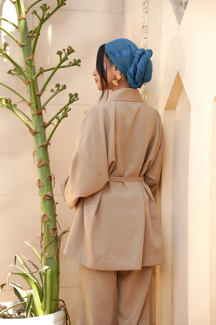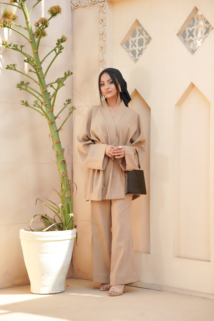 "Exude understated elegance in our skin-beige top, featuring a flattering silhouette and matching belt that cinches at the waist. The soft, neutral hue creates a versatile canvas for everyday wear, while the pairing with matching trousers crafts a polished, put-together look perfect for work or formal occasions."